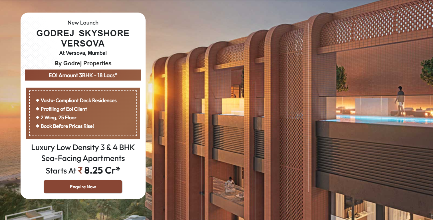 Discover luxury living at Godrej New Launch Versova—exclusive sea-facing 3 & 4 BHK homes with large decks in a boutique community of only 130 units in prime Andheri West. Enjoy stunning sea views, premium amenities, and privacy, all near the upcoming Bandra-Versova Sea Link and Coastal Road for easy connectivity. Perfect for homeowners and investors, this limited launch offers a rare chance to own a premium home in Versova’s fastest-growing luxury corridor. Act fast—don’t miss Mumbai’s next coastal landmark!